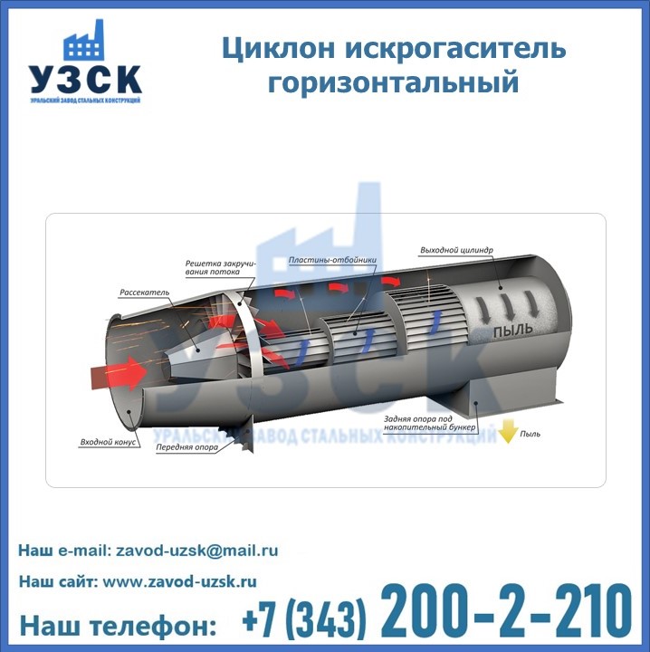 Горизонтальные циклоны-искрогасители ЦГ поставляются в Кургане в сборке или же транспортными единицами для последующей сборки, если предназначены для работы с большими объемами.