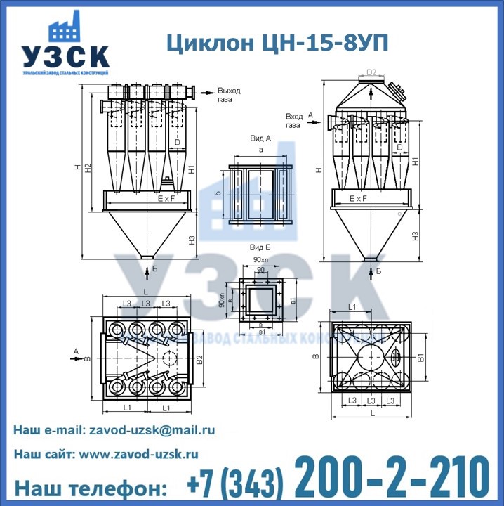 Завод «УЗСК» в Кургане предлагает большой выбор циклонов ЦН-15-500×8УП и прочих устройств, полностью укомплектованных и готовых к эксплуатации. Мы гарантируем соответствие оборудования всем требованиям ГОСТ и ТУ, износостойкость и высокую производительность предлагаемого оборудования. Уральский Завод Стальных Конструкций изготавливает и продает надежное, эффективное и производительное оборудование, имеющее длительную гарантию и большой эксплуатационный ресурс. Если требуется изготовить циклон нестандартных размеров, то такой вариант выполнения заказа тоже предусмотрен, так как предприятие имеет собственные производственные площади и надежных поставщиков. На все поставляемое или производимое оборудование имеются чертежи и прочая техническая документация. Заказать и купить циклоны или прочее оборудование высокого качества и по доступной цене можно через наш сайт или по указанному в разделе «Контакты» телефону.