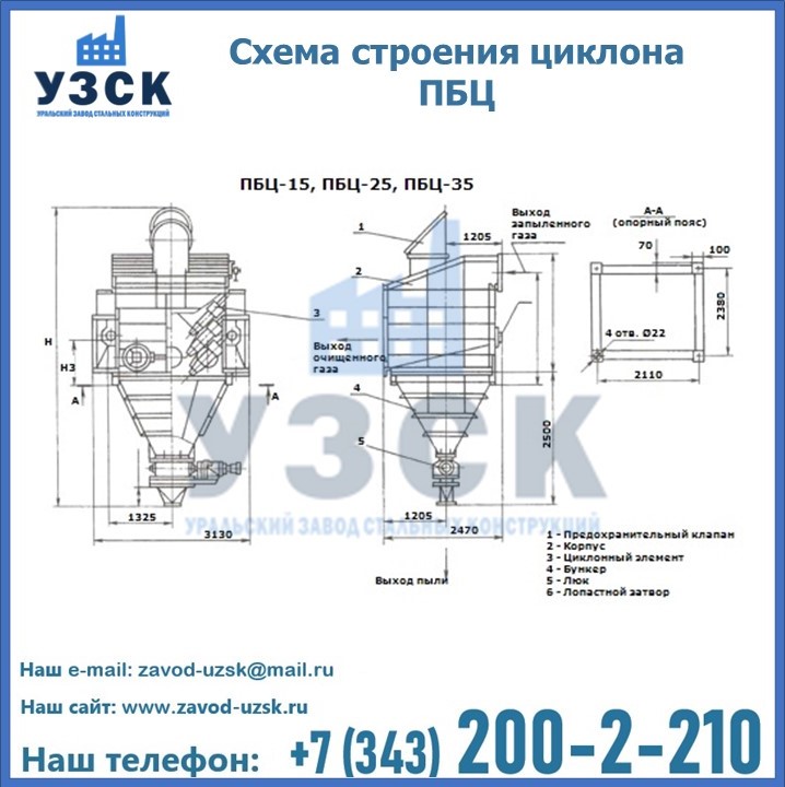Завод «УЗСК» в Кургане предлагает приобрести циклоны ПБЦ и прочие устройства, полностью укомплектованные и готовые к эксплуатации. Мы гарантируем соответствие оборудования всем требованиям ГОСТ и ТУ, износостойкость и высокую производительность предлагаемого оборудования. Уральский Завод Стальных Конструкций изготавливает и продает надежное, эффективное и производительное оборудование, имеющее длительную гарантию и большой эксплуатационный ресурс. Если требуется изготовить циклон нестандартных размеров, то такой вариант выполнения заказа тоже предусмотрен, так как предприятие имеет собственные производственные площади и надежных поставщиков. На все поставляемое или производимое оборудование имеются чертежи и прочая техническая документация. Заказать и купить циклоны или прочее оборудование высокого качества и по доступной цене можно через наш сайт или по указанному в разделе «Контакты» телефону.