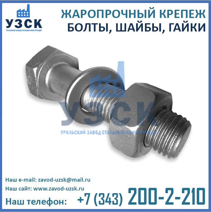 Являясь непосредственным производителем теплостойких метизов, Уральский Завод Стальных Конструкций может изготовить крепеж для высоких температур любого исполнения, как типового, так и нестандартного (по индивидуальным размерам и характеристикам заказчика). У нас Вы можете заказать оцинкованные болты, шпильки и гайки, обладающие жаропрочными свойствами, а также хромированные метизы.