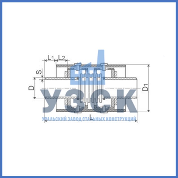 | Условное обозначение | Усл. диаметр DN, мм | D, мм | D1, мм | S, мм | L, мм | L1, мм | L2, мм | Осевой ход, ±λ мм | Жесткость, Сλ, H/мм | Масса, кг |